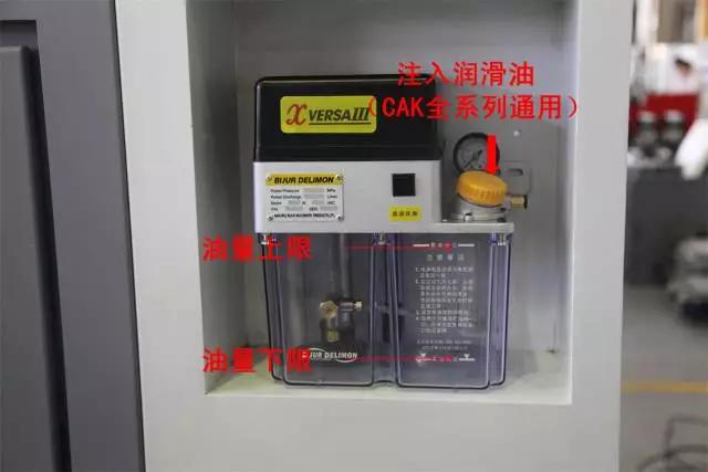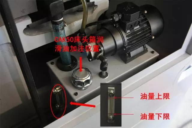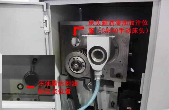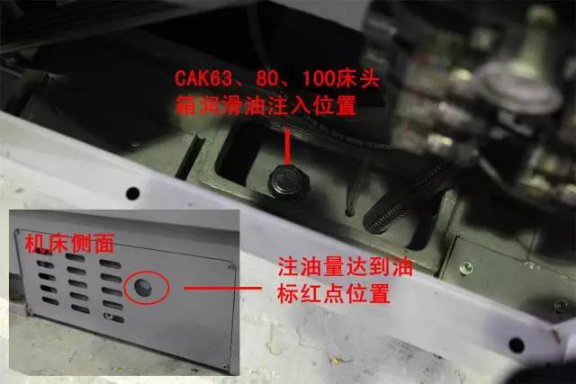 CAK36和CAK40單主軸機床床頭為脂潤滑,無需加注潤滑油。下圖主要介紹機械變檔床頭箱潤滑油的加注方法。